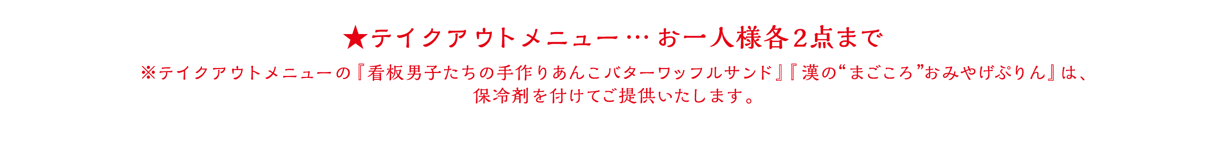 ※1回のご注文でオーダーいただけるメニューの数量に制限をかける場合がございます。また、制限の数は会期前・会期中に関わらず、予告なく変更になる場合がございます。